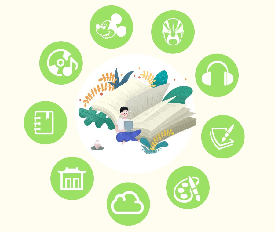 中创电子班牌内置七大精品教育资源库:国学馆、云阅读、动漫馆、书法馆、美术馆、音乐馆和戏曲馆,国内创新设计。