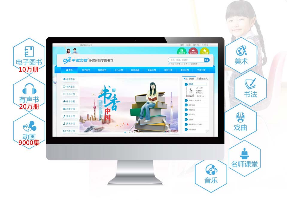 “中创多媒体数字图书馆”是国内创新设计的多媒体数字图书馆,是集图书管理和多媒体数字图书合为一体的数字图书系统,它包含图书管理、图书发布、读者管理和系统维护等功能,同时还收藏了20多万有声图书。馆中图书作品均邀请国内外专业播音人员原声朗诵,声音优美动听、感情丰富,是专为中小学师生及家长设计的、24小时全天候服务的空中图书馆。