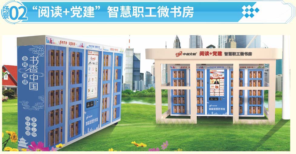 “阅读和党建二合一”的智慧职工书屋是国内创造性实现“党建、职 工书屋、数字图书馆”三合一功能的职工智慧阅读,花一份钱办三件事。它包括智能安全门、智能监控、自助借还机、图书管理系统、电子借阅机等。职工扫描身份证、借书证或手机扫描二维码即可自助借还纸书,也可以通过电子借阅机阅览电子图书和音视频,国内创新设计。