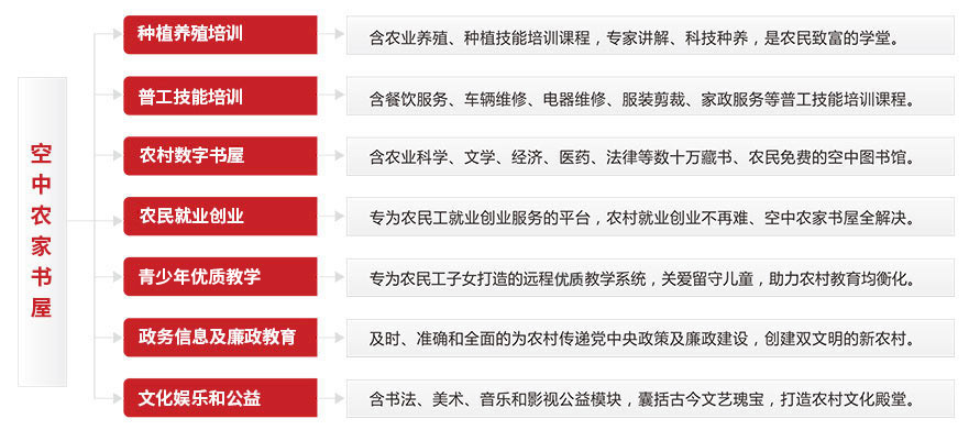 农家书屋工程是政府五大文化惠民工程之一,自2005年试点以来的十多年时间内,农家书屋初步解决了8亿农民群众读书难、看报难的问题,促进了城乡基本公共文化服务均等化,丰富了农民群众精神文化生活。 但是传统农家书屋也逐渐出现了书籍种类偏少、更新缓慢、农民群众不能在手机和电脑等电子设备上使用的问题,满足不了农民群众增收致富需要的现状。 为响应党的十八届三中全会提出的“构建现代公共文化服务体系”的号召,进一步推动农家书屋惠民工程建设,中创文教公司斥巨资、历时数载研发出“空中农家书屋”。 “空中农家书屋”是中创文教公司全新一代的数字农家书屋解决方案,是国内创造性专为农村服务的,集种植养殖培训、普工技能培训、农村数字书屋、农民就业创业、青少年同步教学、政务信息及廉政教育和文化娱乐公益为一体的大型农村多媒体数字综合应用系统,是一座接地气的现代化的数字农家书屋。 “空中农家书屋”能弥补传统农家书屋的不足,能进一步激发广大农民朋友读书学习的热情,真正使农家书屋成为宣传农村政策法规、提供市场信息、传播农业科技知识和开展文明建设的阵地,是农民群众的“充电器”,是新农村发展的“加油站”。 |