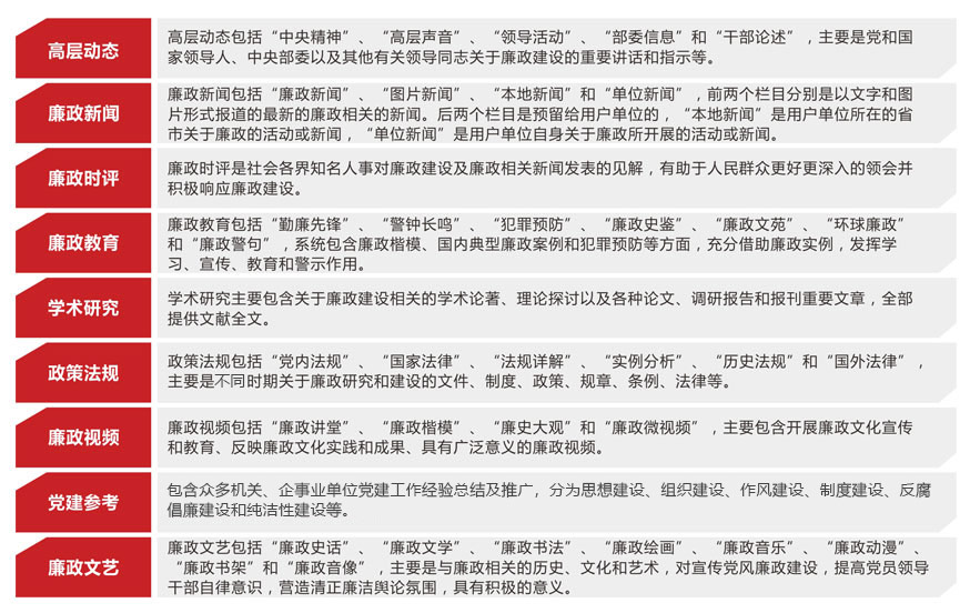 党的十七大第一次将“加强廉政文化建设”写入大会报告,党的十八大以来,新一届中央领导集体把党风廉政建设和反腐败斗争提到新高度,习近平总书记深刻指出:实现中国梦必须坚持党要管党、从严治党,把我们党建设好;党风廉政建设和反腐败斗争是党的建设的重大任务,必须紧紧抓住不放。 为响应党中央提出的廉政文化建设的号召,中创文教耗费巨资研制的“廉政文化教育系统”。该系统是中国廉政文化数据库建设的标志性项目,是中国廉政建设、社科文献数据库的创新之作。 该平台以宣传党的廉政文化建设为主导思想,以服务于党、服务于人民、服务于社会为宗旨,平台内容具有较高的专业性、科学性和实用性,是用户及时、准确和全面掌握党中央廉政建设方针路线以及学习领悟廉政的重要工具。该平台的研制成功有利于为廉政文化的宣传、教育、学习、研究和建设提供高效、系统、直观和优质的服务,有利于推动廉政文化建设向纵深发展。 该平台分为高层动态、廉政新闻、廉政时评、廉政教育、学术研究、政策法规、廉政视频、党建参考和廉政文艺九大栏目40多个分类组成,每日及时更新。而且,该平台具有良好的伸缩性,能为用户定制界面以及所需的多种栏目和内容。 |