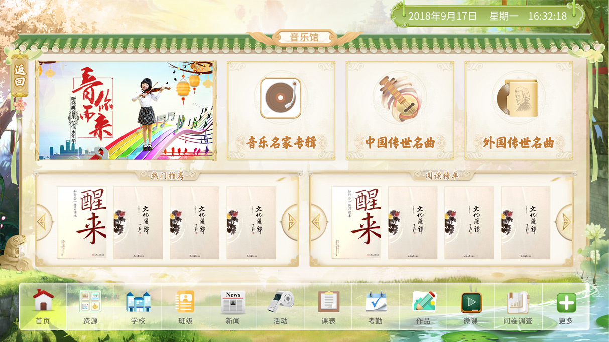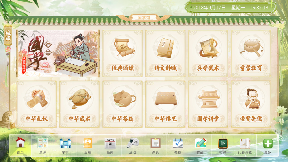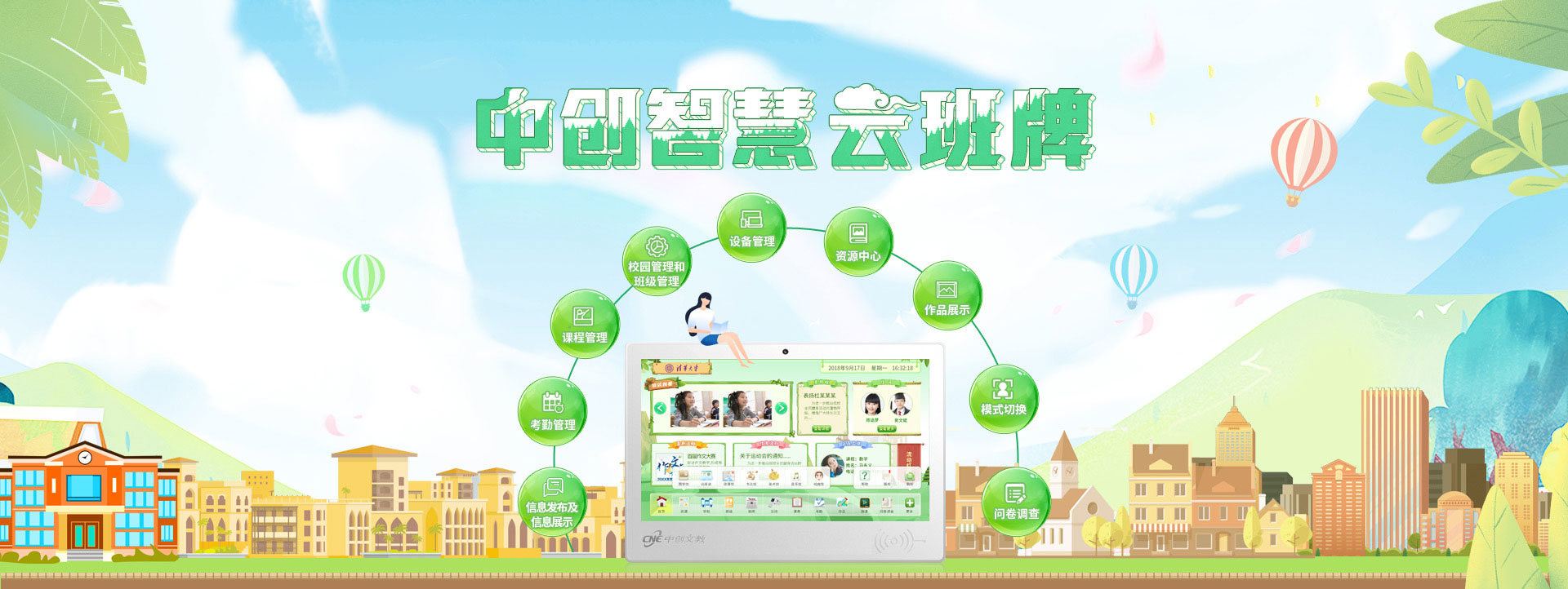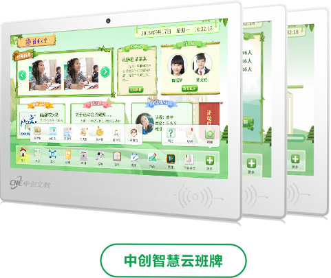 “中创电子班牌”是一款智慧校园多媒体交互终端,它不仅包括智能排课、考勤签到、班级和校级文化展示及信息发布、物联控制、教务管理、学生综合素质评价、家校互联、作品展示、微课、值日、问卷调查等应用,还包括七大精品教育资源:国学馆、云阅读、动漫馆、书法馆、美术馆、音乐馆和戏曲馆,国内创新设计。