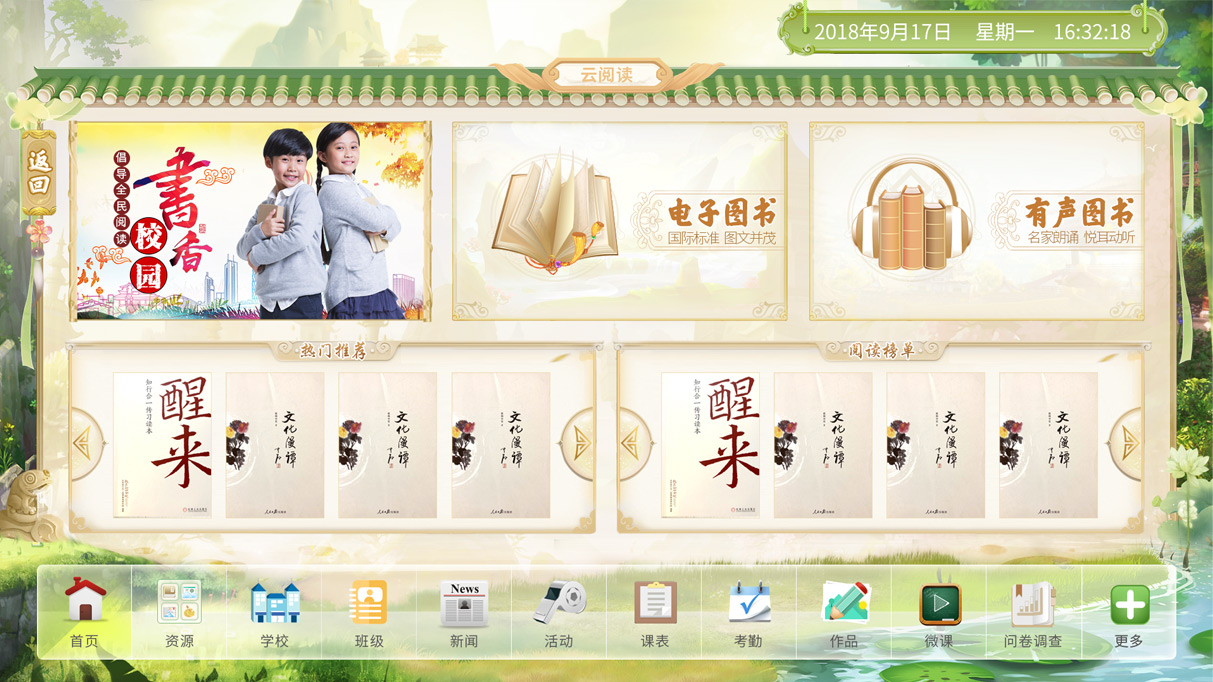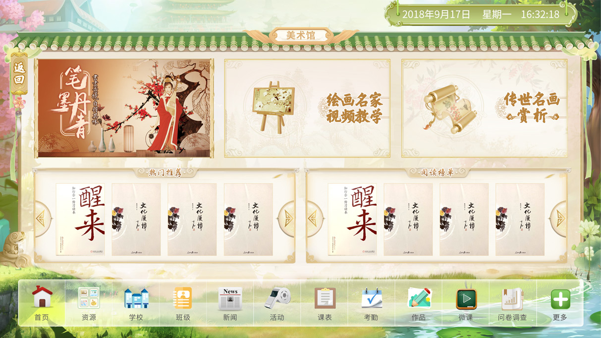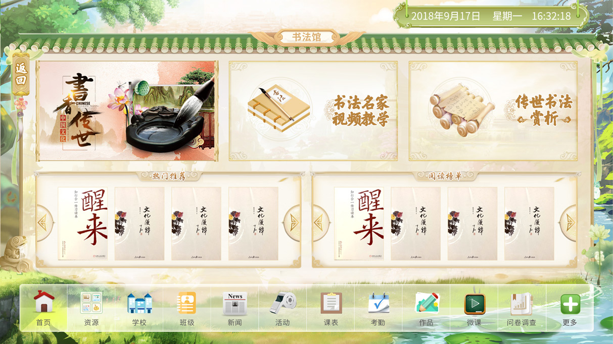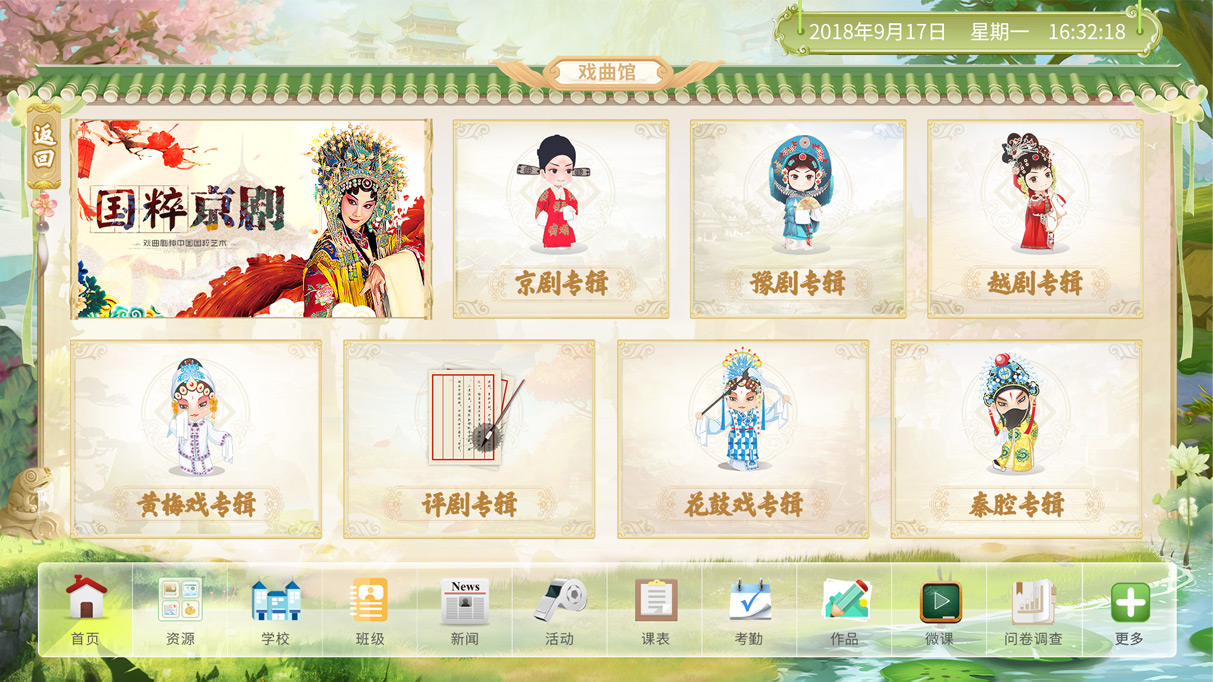 “中创电子班牌”是一款智慧校园多媒体交互终端,它不仅包括智能排课、考勤签到、班级和校级文化展示及信息发布、物联控制、教务管理、学生综合素质评价、家校互联、作品展示、微课、值日、问卷调查等应用,还包括七大精品教育资源:国学馆、云阅读、动漫馆、书法馆、美术馆、音乐馆和戏曲馆,国内创新设计。