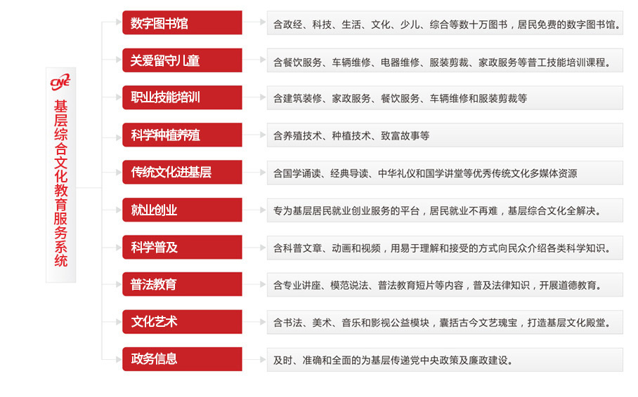 “基层综合文化教育服务系统”包括图书阅读、关爱留守儿童、职业技能培训、科学种植养殖、传统文化进基层、就业创业、政务信息、科学普及、普法教育、文化艺术以及关爱残障特殊人群、关爱留守儿童等基层民众生产生活紧密相关的内容,是基层民众增收致富的“充电器”,是城乡发展的“加油站”。响应《教育信息化“十三五”规划》,优质教育资源反哺社会民生,服务于国家信息惠民、智慧城市和精准扶贫等重大战略需求。